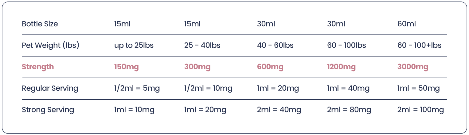 Explore our Pet CBD Dosing Chart for precise dosing recommendations tailored to your products. Alternatively, you can navigate here to discover the recommended serving sizes for CBD Oil for Dogs.
