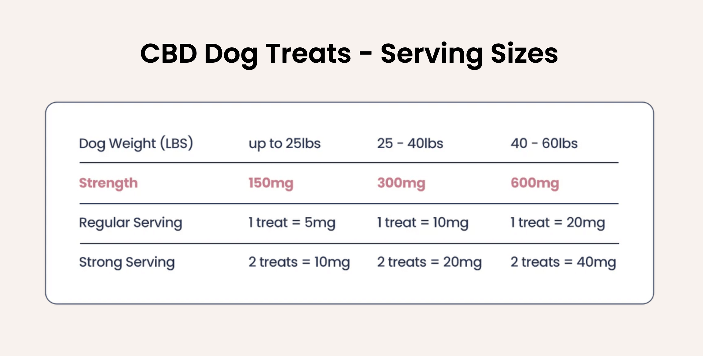 - For dogs 20-60 lbs: 10 mg CBD per treat | 30 treats per bag | 300 mg total