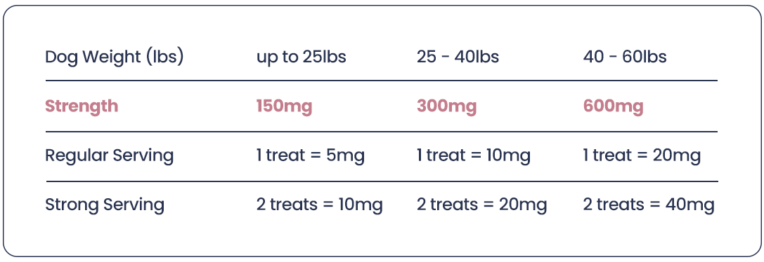 Explore our Pet CBD Dosing Chart for precise dosing recommendations tailored to your products. Alternatively, you can navigate here to discover the recommended serving sizes for CBD Dog Treats + Joint and Mobility Care.