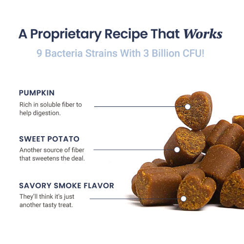 These soft chews will not only ease your dog's stomach troubles but also help put your pup on the path to better wellness. Each heart-shaped chew contains a proprietary blend of 9 beneficial bacteria — a total of 3 billion CFU — that will restore your pup's digestive balance. And with a delicious and beneficial sweet potato and pumpkin blend in every bite, these treats will give your pup the extra push they need to maintain healthy digestion!