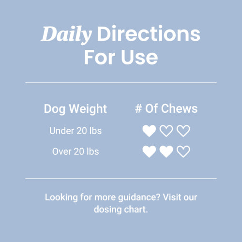 We recommend you give your dog these Soft Chews once a day or as needed. Here are the recommended serving suggestions based on your dog's weight: