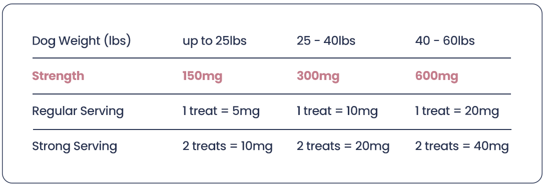 Each calming chew contains 5mg of broad-spectrum CBD. “Broad-spectrum” cannabidiol contains no THC whatsoever. You can give your dog calming treats as needed for their meltdowns or daily for a tasty snack or training reward. We recommend the following dosing guidelines: